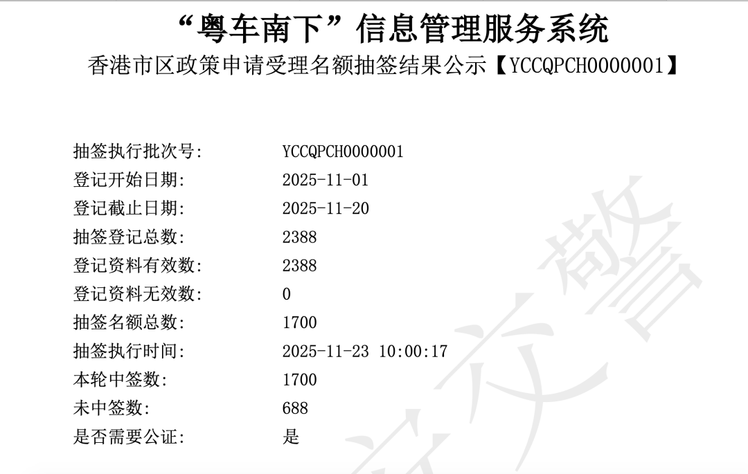 “我中奖了!下个月我就可以开着广东车去香港了!” 11月23日10时09分,广州先生的车主在微信朋友圈高兴地发了一条消息。当天,香港城市“粤车南下”抽奖结果正式出炉。据“粤车南下”信息管理系统公告,共有2388人参与抽奖,1700人中奖。 “粤车南下”香港城市政策抽奖结果揭晓。 10月31日,“粤车南下”香港政策正式公布,首批在广州、珠海、江门、中山4个城市开放。其中,广东车辆进入香港市区政策自2025年11月1日9:00起开始,11月23日10:00抽签,12月9日9:00接受中签申请。12月23日零时起,广粤地区获批私家车车主成功预约后,即可通过港珠澳大桥珠海公路口岸在香港市区行驶。根据粤港双方协议,政策实施初期,广东车辆进入市区时每个工作日受理的车辆申请数量为100辆,并根据实施情况逐步增加。为了体现政策的公平性,申请车辆进港的人士必须先报名抽签,中签后才能提交车辆申请材料。 12月份第一批验收共1700个(每天100个,17个工作日)。港珠澳大桥上行驶的汽车(资料图)张先生告诉羊城晚报记者,他去年从广州来香港打工,他的广东a牌汽车停在深圳。去年,他开始关注“粤车南下”政策。 11月1日,报名开放第一天,他立即提交了申请。 “只要有内地身份证、驾驶证、驾照、车辆登记证、香港驾驶证就可以申请,我都有,觉得申请很方便。”张先生说道。 11月23日上午10点,第一轮抽签正式开始。 10时01分,张先生登录系统查看,发现自己中奖了。 “第一批2388份申请中,只有688份没有入选,中标率还是很高的。”他说。张先生成功中得首批“粤车南下”进港城市抽奖(采访者提供)。为什么要申请“粤车南下”进入香港市区?张先生告诉记者他来香港已经一年多了,通常大部分时间都在香港度过。如果你能在香港市区驾驶自己的粤A牌汽车,你可以探索越来越多的地方。 “比如香港、大屿山、迪士尼、西贡等国家公园都比较远,开车会比较方便。”张先生说。中奖后,他计划预约12月25日开车前往香港市区,利用香港圣诞假期,开车带家人环游香港,并游览大屿山。随后他将驱车穿过港珠澳大桥前往珠海游览。如果有时间,他会顺便去澳门购物。他将于周末返回广州,周一假期结束后返回香港工作。 “粤车南下”政策的实施,让张先生对假期充满了期待。 “双城生活”一度从地铁搬到高铁,然后前往“大湾区生活”的驾车。 “Pa只是我,这是一件好事,我真的很期待。”张说。来源 |羊城晚报、羊城学校、金羊网 正文 |张路遥