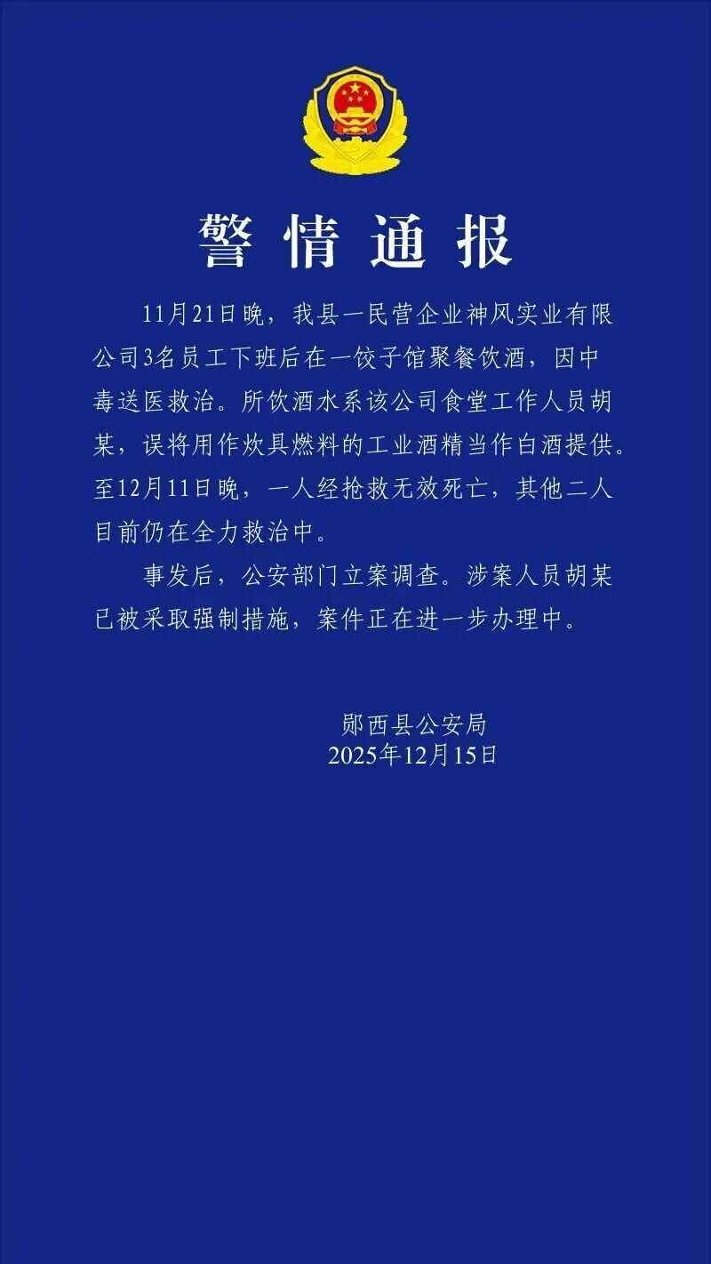 12月15日晚,湖北省十堰市郧西县公安局发布警方通报:11月21日晚,郧西县私营企业神峰实业有限公司3名员工下班后聚集在一家饺子馆喝酒,中毒身亡,被送往医院救治。饮用水是公司食堂工作人员胡某提供的,他将用作炊具燃料的工业酒精误认为是酒精。截至12月11日晚,1人因抢救无效死亡,另有2人仍在全力救治中。案发后,公安部门已立案侦查。涉案人员胡某已被采取强制措施,案件仍在办理中。来源 |平安云熙 编辑:舒梦清