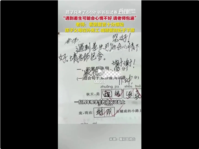 孩子考试得了44分。爷爷在试卷上道歉:遇到差生可能心情不好。请老师原谅。老师说他被这份善意感动了。 近日,来自湖北宜城的一份试卷让人感动。孩子考试只得了44分。爷爷在试卷上道歉:“遇到差生可能心情不好,请原谅。”老师说,父母的善良让他感动。邱老师告诉记者,这只是一次小测试。孩子的父母平时都在外地工作,成绩并不理想。他们也很淘气。 “我被这个消息深深吸引了。”来源 | @九新闻 襄阳电视台 编辑:舒梦清